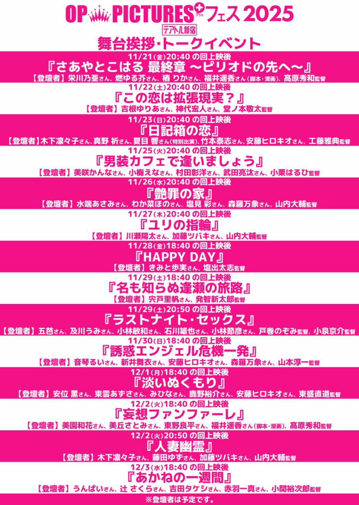 R15+のピンク映画の祭典「OP PICTURES+フェス2025」が、11月21日から12月4日にかけて東京・テアトル新宿で開催決定。